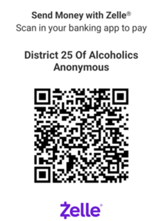 District 25 is part of Area 59 of Alcoholics Anonymous. Contributions are welcome. Many groups give contributions to the GSR to bring to the monthly meetings (1st Tuesday of the month at 7 PM); Other groups mail in contributions, and electronic contributions via Zelle are another option. You can find the Donation form here. The District Mailing Address for contributions is: